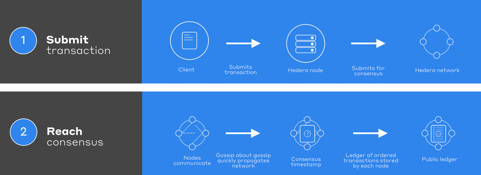 - Transaction: type of request, for instance, an HBAR transfer or a smart contract call