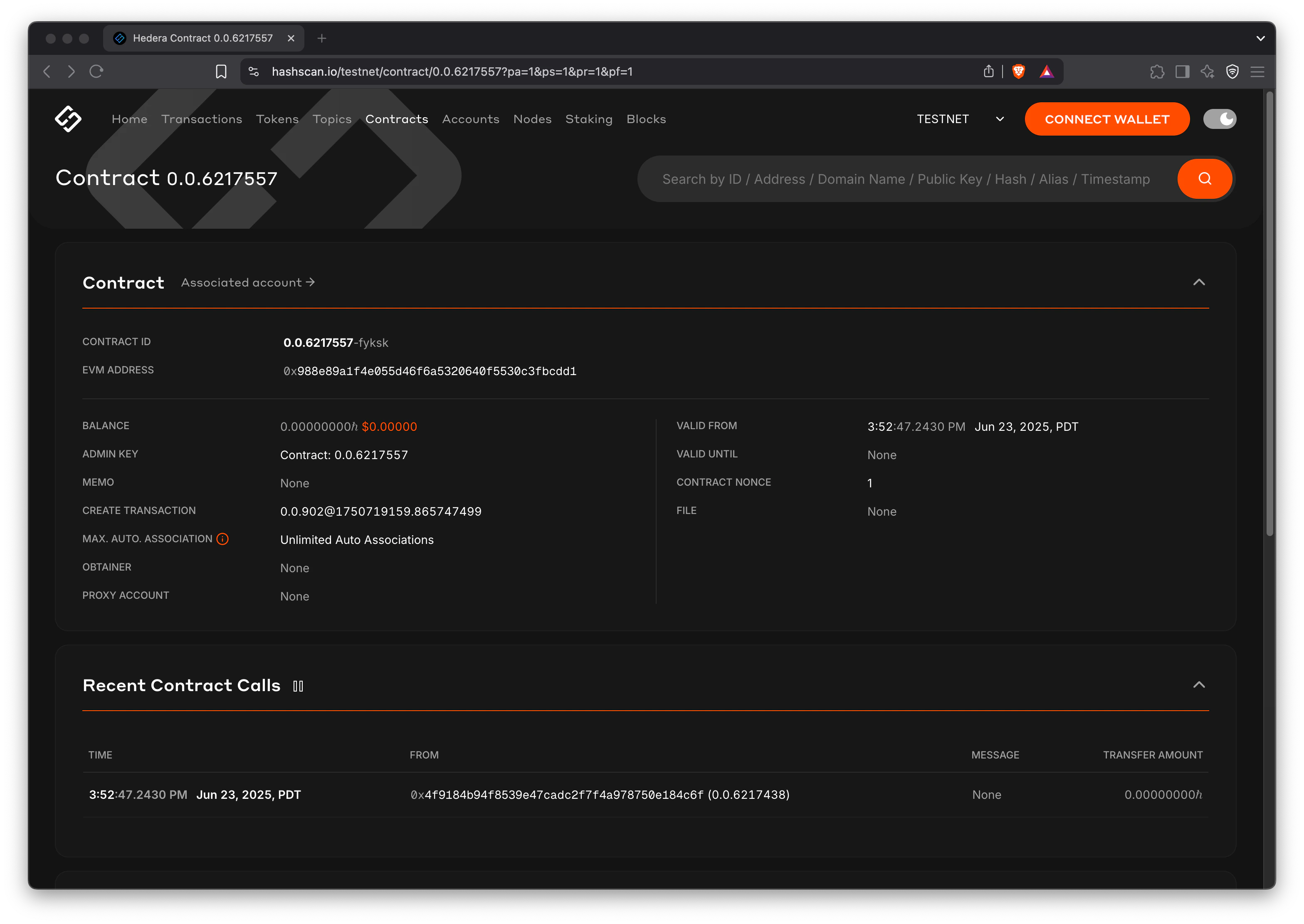 Navigate to the HashScan network explorer and use the contract address to search for your contract to view the details.