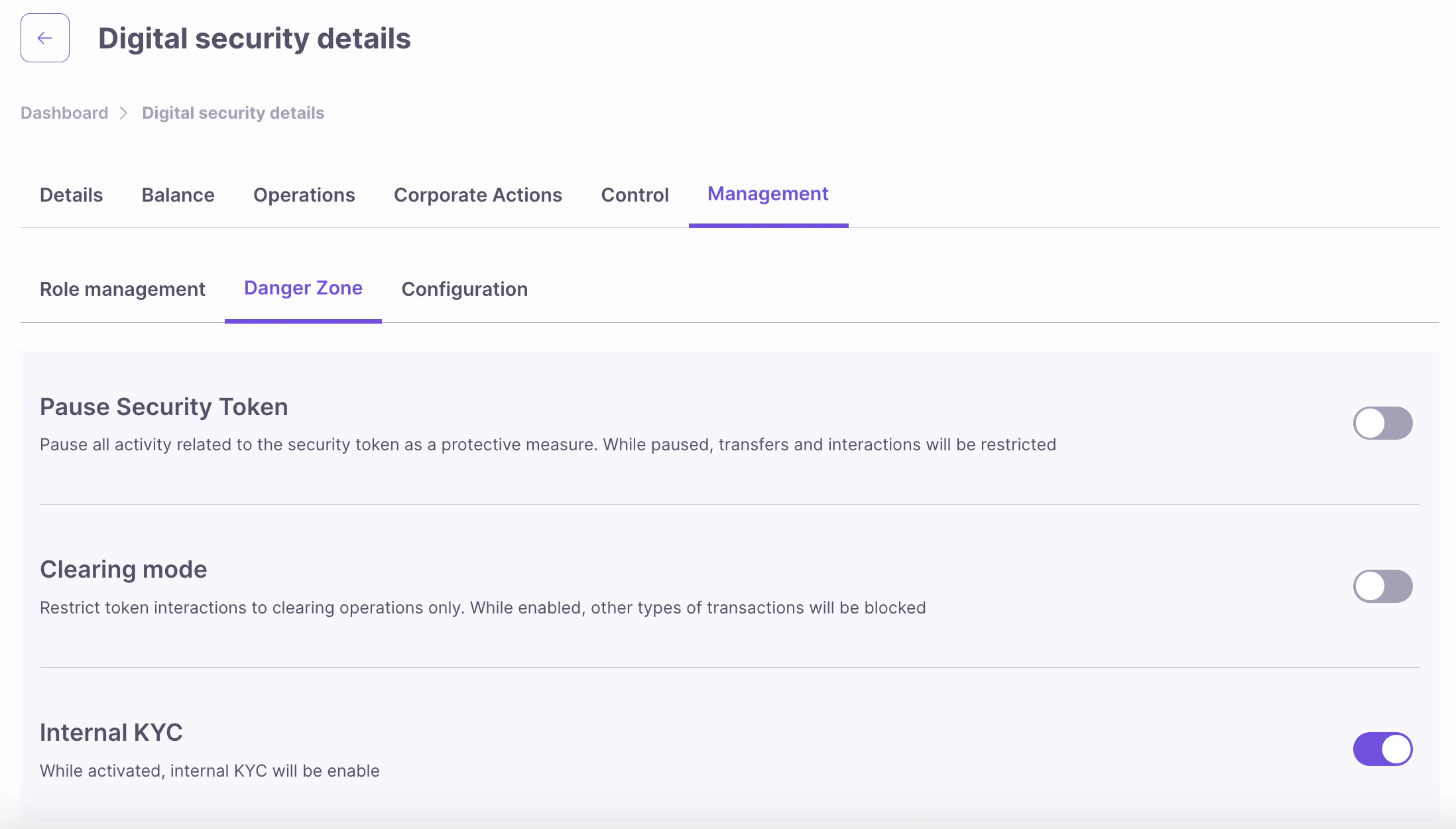 - Role Management: Enables the assignment and management of roles (e.g., Admin, Minter, Controller) for specific users, determining their permissions and access to various operations within the digital security.