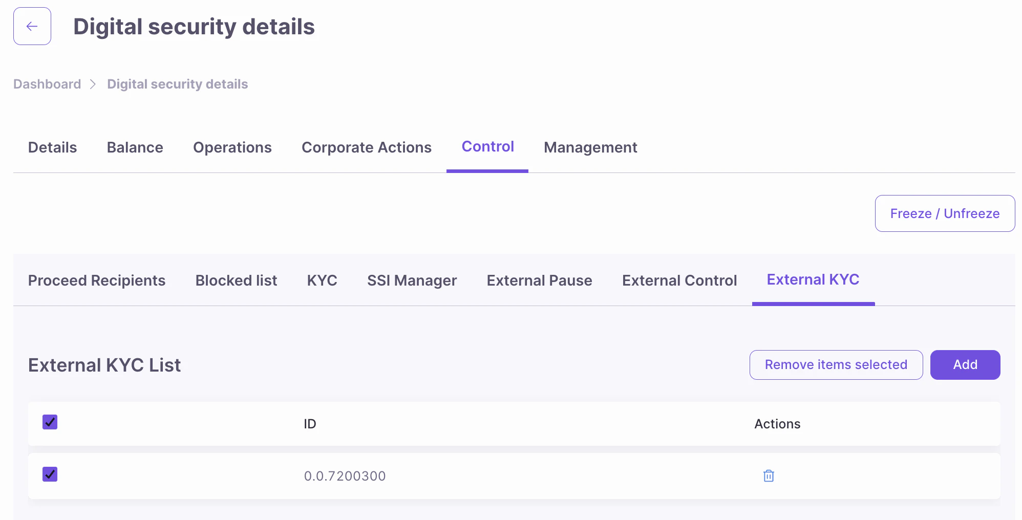 - External KYC List: Select external KYC (Know Your Customer) verification contracts that validate investor identities and compliance status. This enables integration with third-party KYC providers.