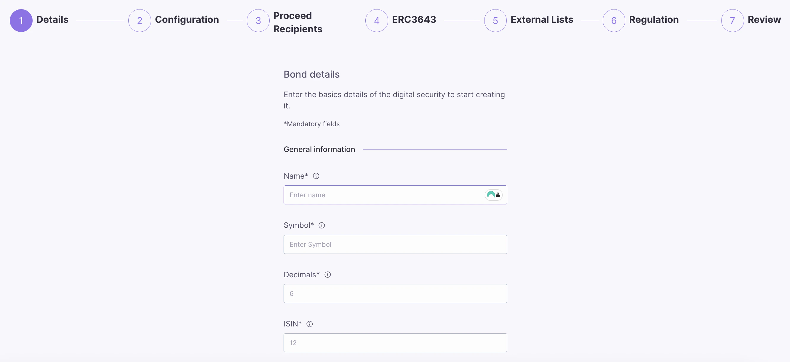 Enter the bond details, such as the nominal value, number of bond units, starting (mint) date, and maturity date.- Number of Bond Units: The total number of bond tokens to be issued. Each unit represents a fraction of the overall bond and can be bought, sold, or transferred.