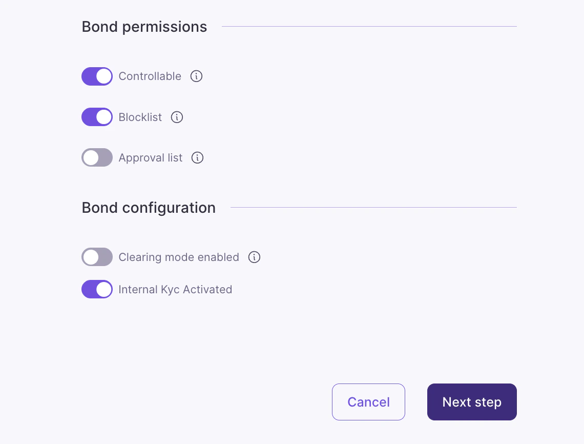 Toggle the permissions you want to enable for your new bond:- Controllable: Enables token controller role and compliance operations.