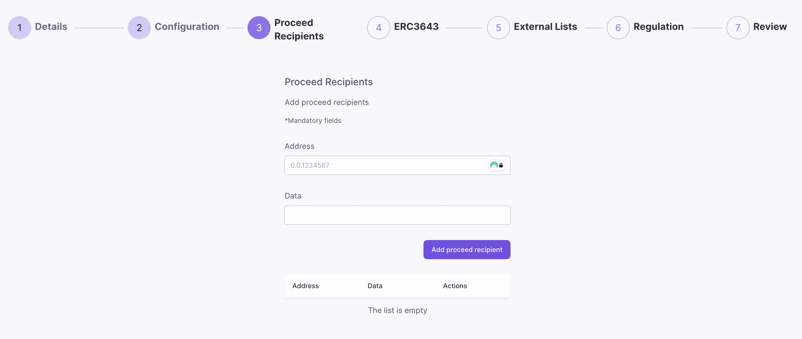 Define the recipients who will receive the bond proceeds from the offering. This step allows you to specify one or more Hedera accounts that will receive the funds raised from the bond issuance.- Address: The Hedera account ID of the recipient who will receive bond proceeds. This must be a valid Hedera account ID format.