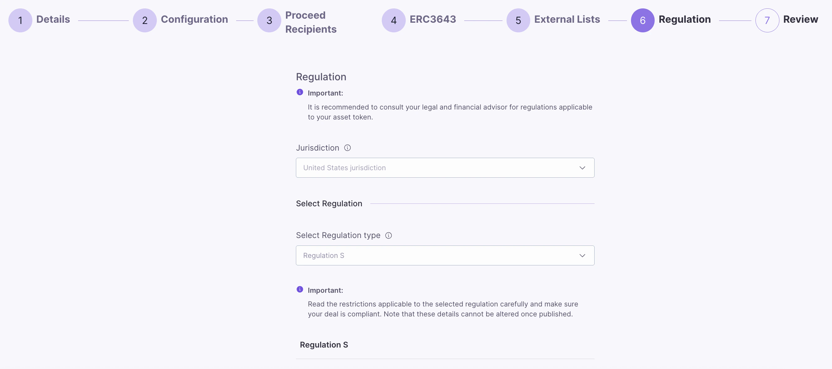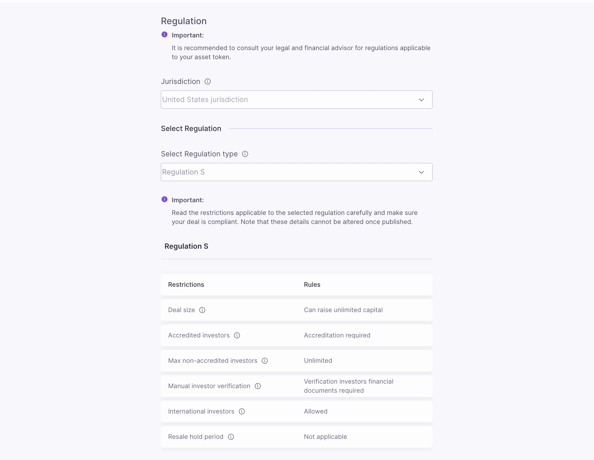 Select the applicable regulation for your equity offering. The regulation determines the legal framework and compliance requirements that will govern the issuance and trading of your digital security.