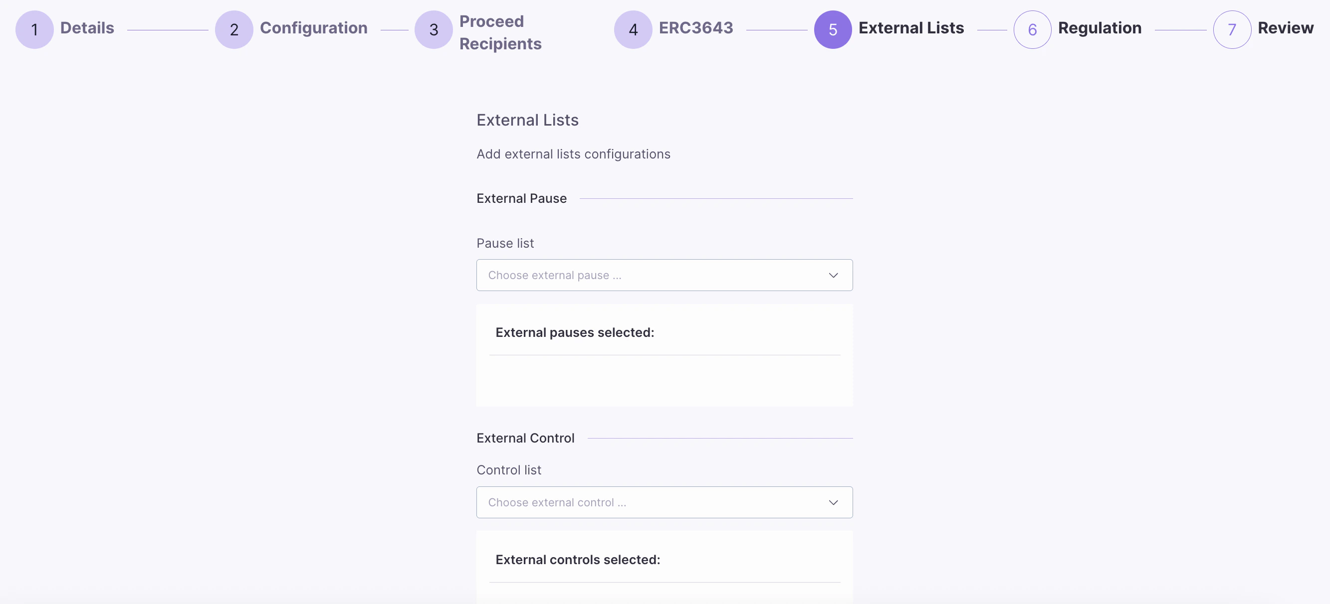 Configure external management lists for enhanced control over your equity. These external lists provide additional layers of security and compliance by integrating with external smart contracts.- External Pause List: Select from available external pause contracts that can trigger emergency pauses of token operations. Multiple pause contracts can be selected to provide redundant safety mechanisms.