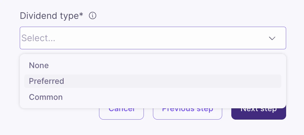 Types of dividends available for equity holders, including none, preferred, and common dividends.- None: Equity holders won’t receive dividends.