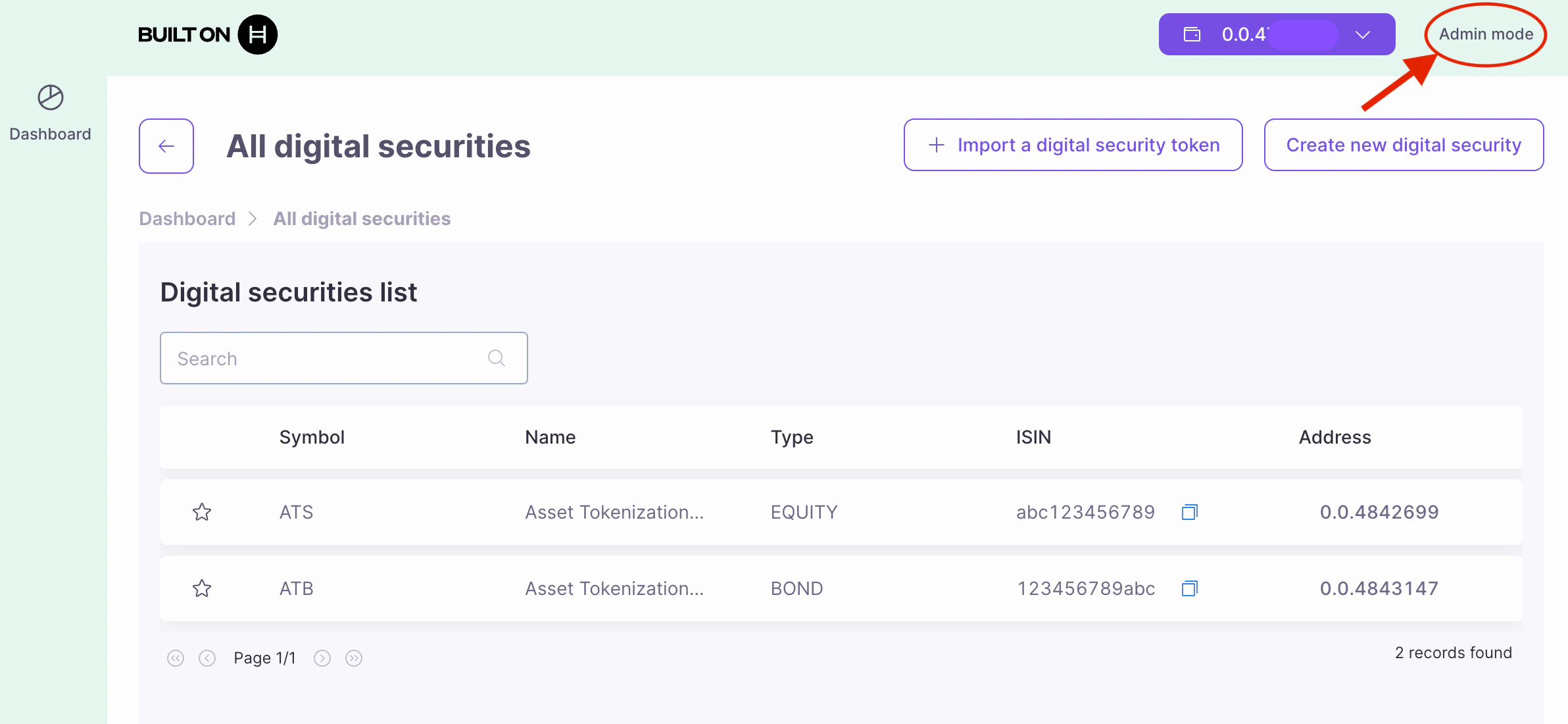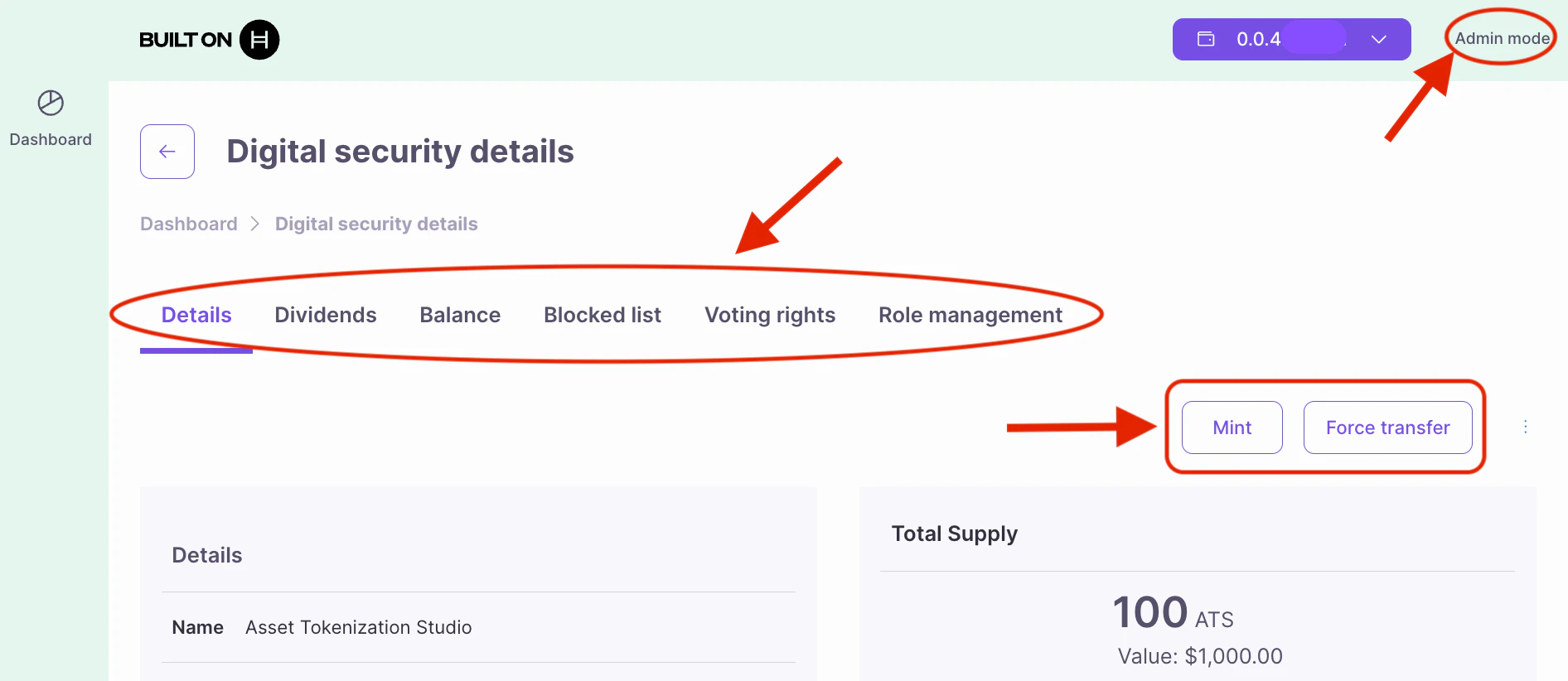 After assigning roles, ATS will display all operations available for each digital security based on the roles your account has been assigned. Simply click on the corresponding tab and follow the on-screen prompts to complete each operation. Here’s a rundown of the available operations by dashboard mode:Admin (mode) Dashboard