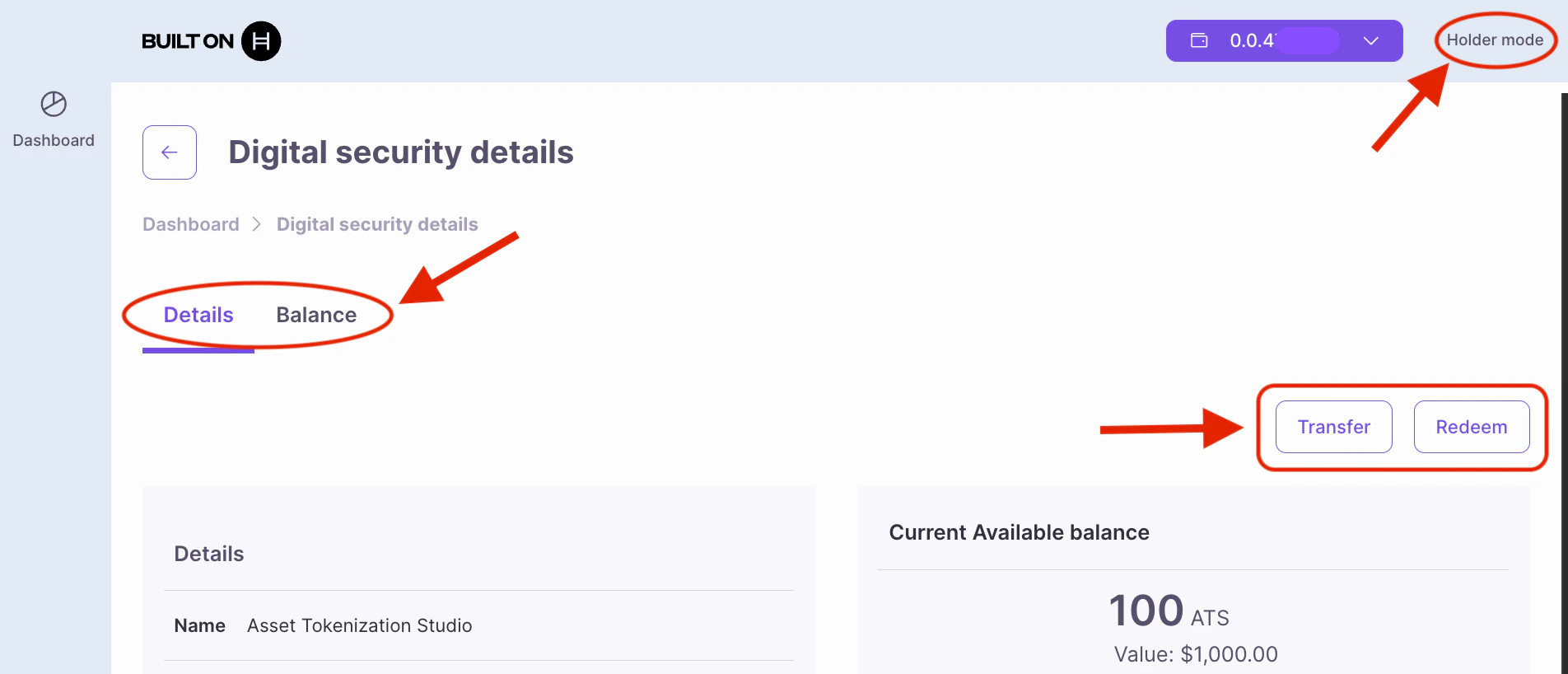 - Balance: Displays the token holder’s current balance, providing a real-time view of the total tokens held for the selected asset.