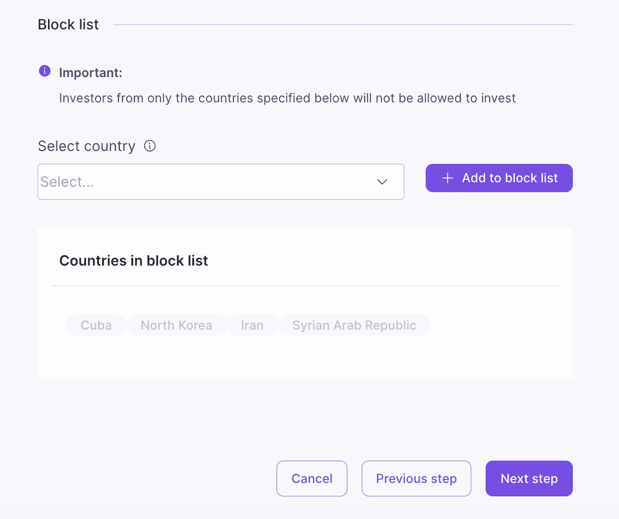The blocklist is responsible for prohibiting specific investors from participating in a tokenized offering. Investors from the countries mentioned on this blocklist would not be able to invest in the digital security. This functionality allows an issuer to adhere to particular legal, regulatory, or operational constraints applied to specific jurisdictions. For this, the issuer can select a country and then blocklist it to ensure that residents of that country do not create or participate in an offering.Important: Investors from only the countries specified below will not be allowed to invest.