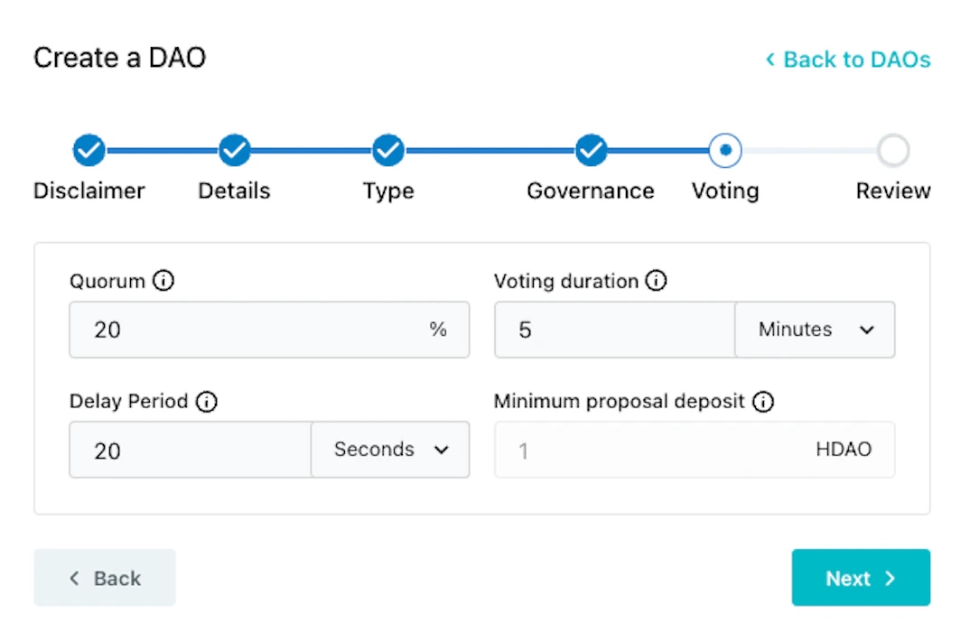 Define the DAO’s NFT and voting details. You have the option to create a new governance token or use an existing one. For the purposes of this tutorial, we will create a new one. Define the details for your new governance token: