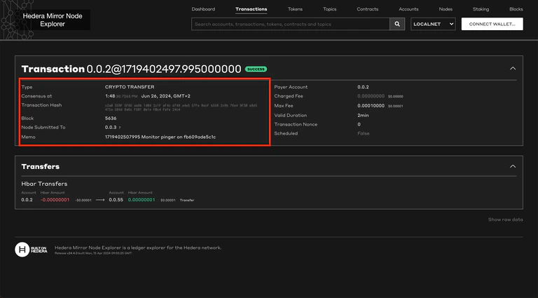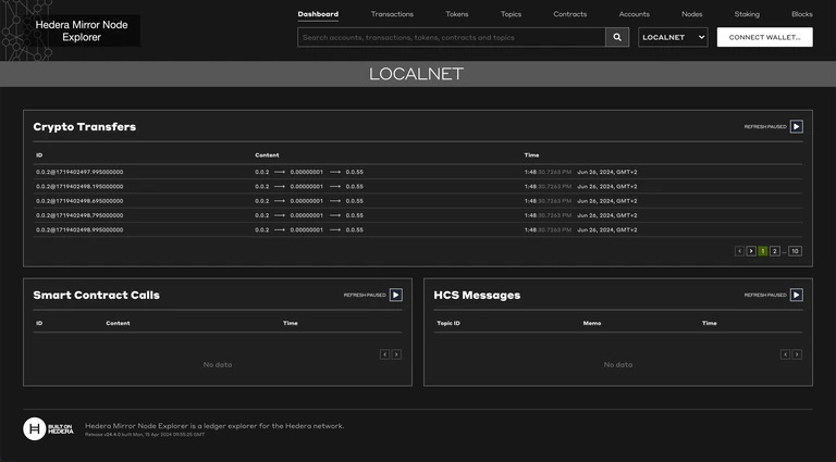 Visit the local mirror node explorer endpoint (http://localhost:8080/devnet/dashboard) in your web browser. Ensure thatLOCALNET is selected, as this will show you the Hedera network running within your local network.